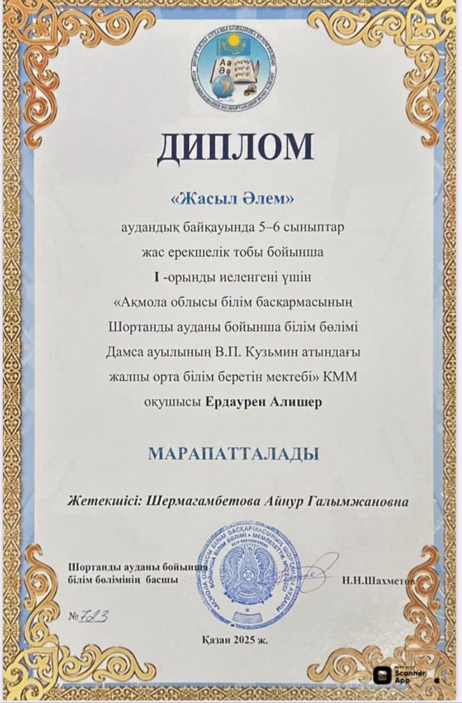 "Ақмола облысы білім басқармасының Шортанды ауданы бойынша білім бөлімі Дамса ауылының В.П. Кузьмин атындағы жалпы орта білім беретін мектебі" КММ. "Жасыл Әлем" байқауында бірінші орын.